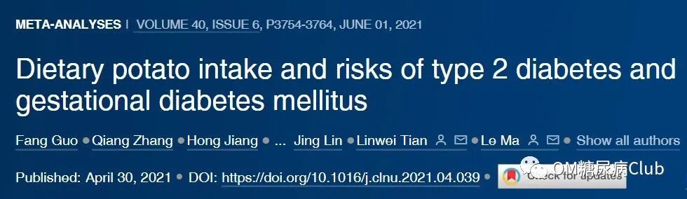 Clinical Nutrition:马铃薯摄入量与2型糖尿病和妊娠糖尿病发病风险的相关性